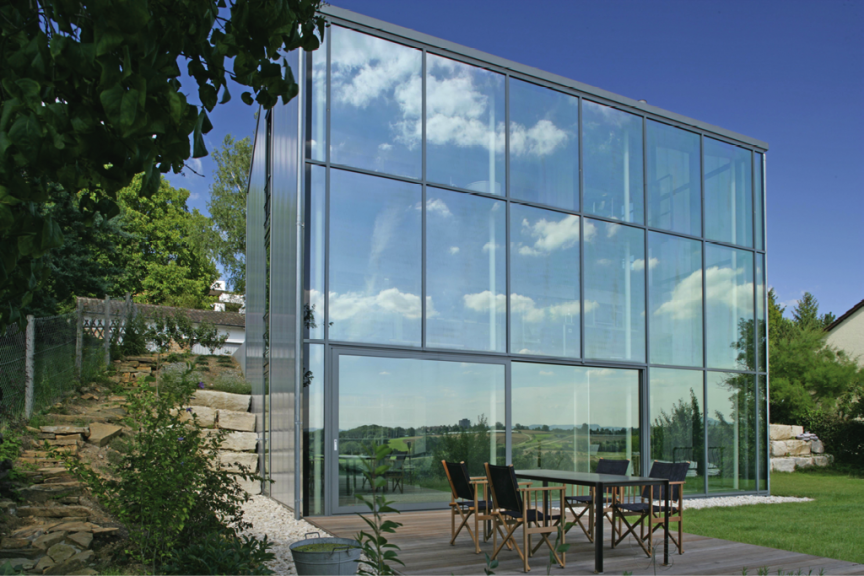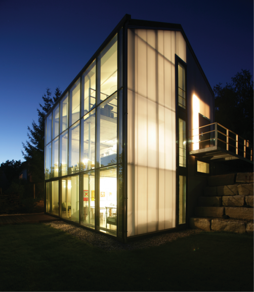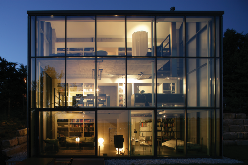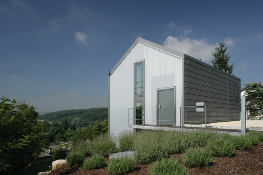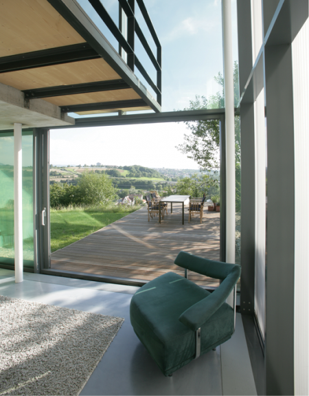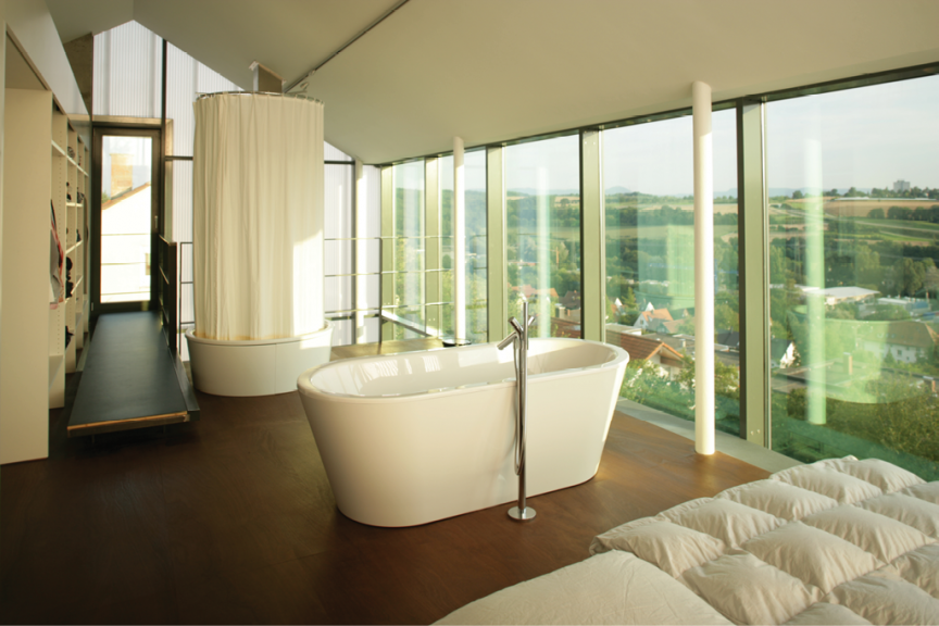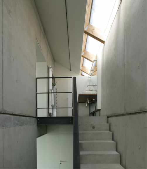 Die Aussteifung erfolgt hangseitig über einen massiven Kern in Sichtbetonqualität.